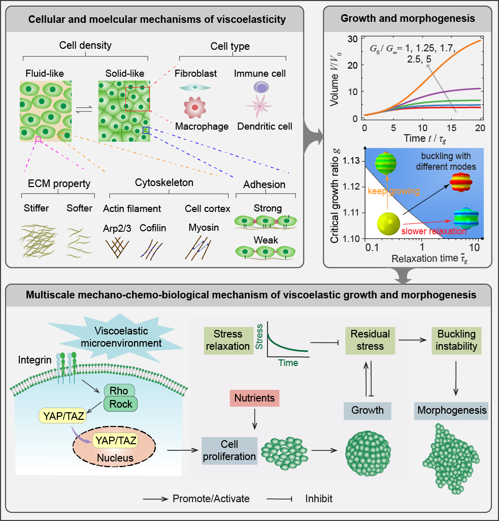 Most soft biological tissues feature distinct mechanical properties of viscoelasticity, which play a significant role in their growth, development, and morphogenesis (Figure 1a). To reveal the biophysical mechanisms, we first proposed a mechanobiological viscoelastic model in the framework of thermodynamics (Lin et al., 2025). Then, we used a more novel method, the physics-informed neural network (PINN) to simulate the tissue growth and morphological evolution (Lin et al., 2026), (Figure 2, and the open-source code in Github). With PINN, buckling occurs naturally under the critical states during the oscillated training process without introducing artificial perturbations. Our studies have demonstrated that viscoelasticity facilitates sustained tissue growth and significantly influences the critical conditions of surface wrinkling and tissue morphology. In the future, we hope to apply the cross-scale theories, e.g., the strain gradient viscoelasticity (Lin & Wei, 2020), to characterize the multiscale / crossscale properties of biological tissues.
